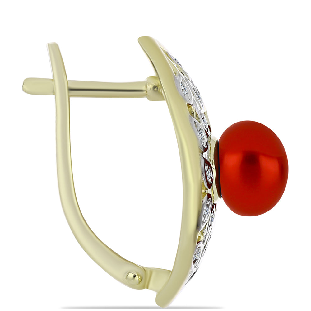 Pozlacené Stříbrné Náušnice s Červená sladkovodní Perlou a Bílým Topazem - Karátové číslo: 4.78. přibližná hmotnost: 7.67 gramů KÓD: Y60209 Velikost Šperku: 21.90 mm x 13.65 mm Zapínání náušnic: Ruský patent